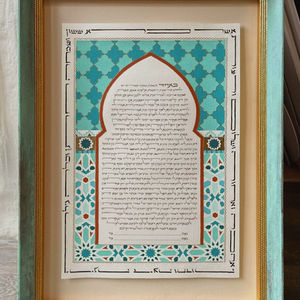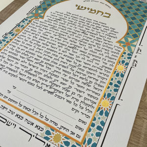Together we create a unique and personalized design for your Ketubah, you can send reference pictures for patterns/color palettes. The design can be painted with gouache, acrylic paint or watercolor. Gold leaves can also be added (at an additional cost)